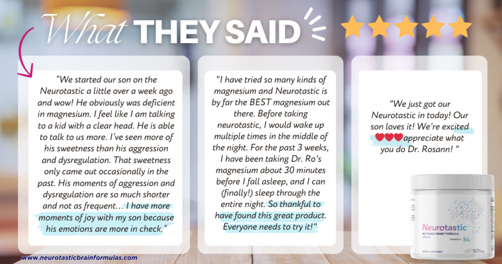Switching to Neurotastic™ means choosing a magnesium supplement expertly crafted for brain and mental health by Dr. Roseann Capanna-Hodge, a renowned specialist in children’s mental health. Our formula contains clinically proven, highly bioavailable magnesium forms—Magnesium L-threonate, Glycinate, and Malate.